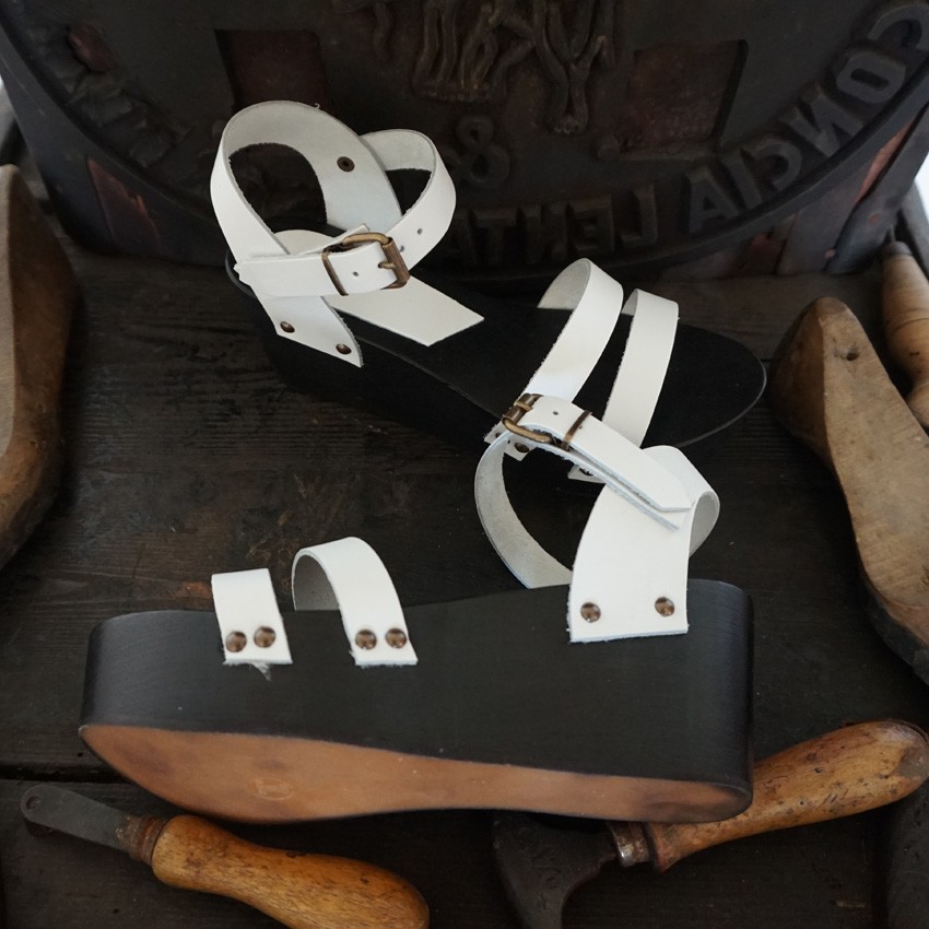 The manufacturing of the sandal begins by cutting the leather for the sole, insole and heel and follows by cutting the genuine vegetable tanned leather for the uppers.